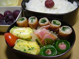 キュウリの甘酢生姜巻き ベーコンと玉ねぎとピーマンの炒め物 豚肉のネギ巻き ネギ入り玉子焼き ミニトマト うめぼしご飯 種無し巨峰