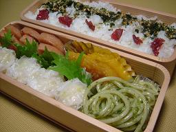 パスタジェノベーゼ エビシュウマイ かぼちゃの甘煮 ランチハンバーグ 水菜 梅干とのりごまごはん