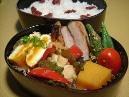 かぼちゃの煮物 イカとゴーヤとピーマンの炒め物 半月甘酢卵 オクラの胡麻和え 黒豚の味噌漬け ミニトマト うめぼしご飯