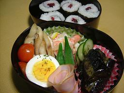 揚げナスの胡麻和え ハム ゆで卵 エビのレモンマリネ 魚のから揚げ ミニトマト、キュウリ 茹でオクラ 梅のり巻き