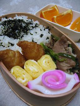 薔薇かまぼこ たまごやき 竹の子揚げ 肉野菜炒め 梅わかめ御飯 たんかん