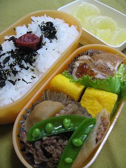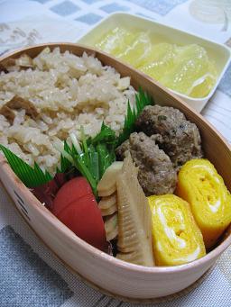 たまご焼き 竹の子入り肉団子 竹の子の煮物 水菜と塩トマト 竹の子とじゃこの炊き込みご飯 サワーポメロ