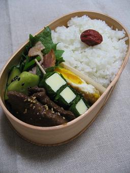 焼肉 チーズのしそ巻き 照り焼き目玉焼き きゅうりのピリ辛 小松菜とベーコンの炒め物