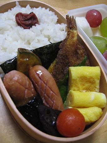 ミニトマト たまご焼き バルサミコなす ウィンナー キスのフライ かぼちゃのソテー 海苔 ごはん 梅干 ぶどう・梨