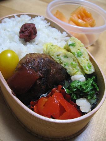 パプリカのマリネ 小柱と白菜のあっさり中華炒め おからバーグ ネギ入りたまご焼き ミニトマト のりごまサンドごはん 梅干 メロン