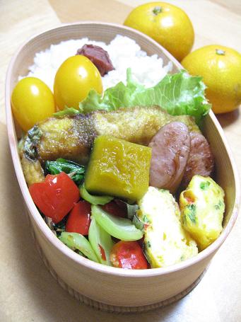 パプリカとネギのたまご焼き 青梗菜とパプリカのXO醤炒め かぼちゃ煮 ウィンナー 鰆のカレームニエル レタス・ミニトマト 梅干ごはん みかん なんだか黄色が多いお弁当だった