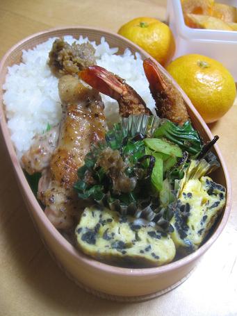 ひじき入りたまご焼き 青梗菜の塩こんぶ炒め 鶏手羽の炙り焼き エビフライ ごはん・豚味噌 柿・みかん