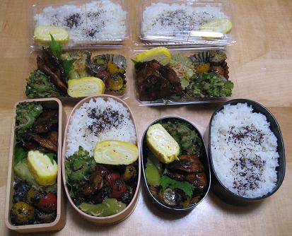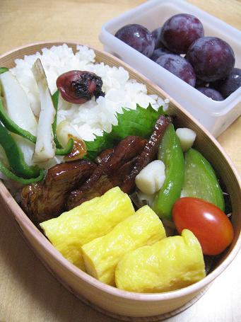 たまご焼き なすと小柱の薄煮 黒豚焼き豚 ミニトマト ピーマンと竹輪のきんぴら 梅干ごはん 巨峰