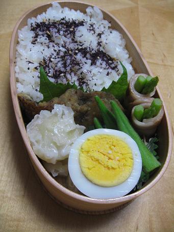 ゆでたまご アスパラベーコン巻き オクラマヨ 海老しゅうまい シイラのガーリック揚げ ゆかりご飯
