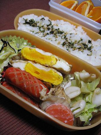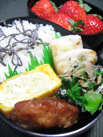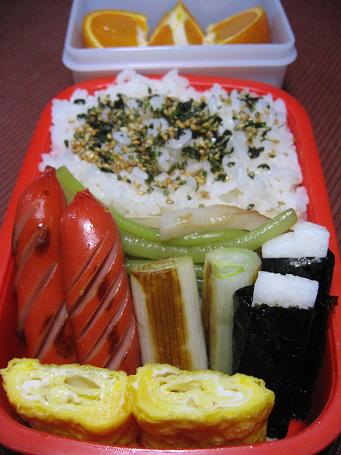 玉子焼き 焼きネギ 赤ウィンナー 長芋の梅海苔巻き ツワブキの炒め煮 のりごまご飯
