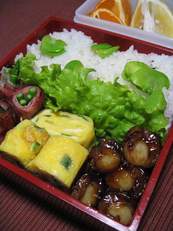 ベビーホタテの甘辛あん 韮入り玉子焼き アスパラハム巻き そら豆ごはん タンカン ?ミカン