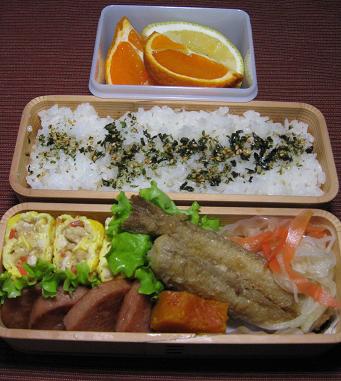 鱚の南蛮漬け 南瓜の甘煮 ランチバーガー 鶏そぼろ入りたまご焼き 海苔胡麻ごはん タンカンと?みかん