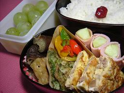 五目玉子焼き 鯵の磯辺焼き 3色ピーマンのきんぴら 瓜のハム巻き なすと揚げと椎茸の煮物 梅干ごはん マスカット