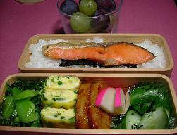 胡瓜の紫蘇ワカメ和え 鰯バーグ 葱入りたまご焼き 青梗菜のオイスター炒め かまぼこ 焼鮭 のりごはん 巨峰・マスカット