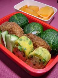ピーマン入り玉子焼き 肉じゃがコロッケ スティック胡瓜 高菜のおむすび 柿