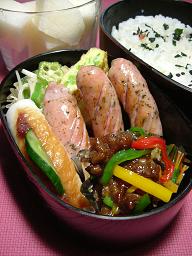 チンジャオロース ちぎりの梅肉胡瓜サンド 大葉入りソーセージ ニラ入り玉子焼き エノキとオクラのポン酢和え 梅ワカメご飯 梨