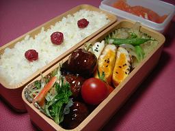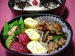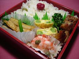 海老と新玉ねぎのマリネ ちくわとニラのカレー炒め 鶏の照り焼き えんどう玉子焼き まめごはんと小梅ちゃん 毎週月曜日がお弁当の日となりました