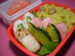 ピーマンと南瓜の揚げびたし ホタテのフライ 魚肉ソーセージ きゅうり竹輪 カレーピラフ ルビーグレープフルーツ