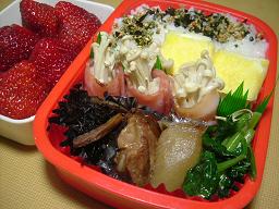 ほうれん草のバターソテー なんこつと大根のべっこう煮 ひじき えのきベーコン巻き たまご焼き のりごまご飯 いちご