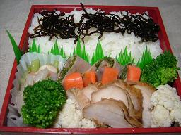 カリフラワーと人参のピクルス 鶏の香り煮 ジェノバチーズのハムサンド ツワ蕗とベーコンの炒め煮 茹でブロッコリー からししそ昆布ごはん