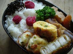 ウィンナー ゆで卵 偽ホタテフライ 人参のきんぴら ブロッコリーの貝柱入りオイスターソース炒め 小梅と白米