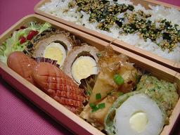 カマンベールチーちく揚げ 筍の土佐炒め ウィンナー スコッチエッグ キャベツの梅肉和え のりごまごはん