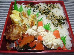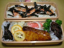牛肉とごぼうの甘辛煮 ブリの照り焼き ひじき煮 スモークサーモンのレモンマリネ カリフラワーのコンソメ煮 まるかじり金柑 ブロッコリー 鮭海苔ご飯 りんご