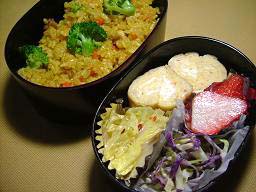 紫キャベツのコールスロー 白菜のバターソテー カニ入りたまご焼き いちご 鶏とブロッコリーのカレーピラフ