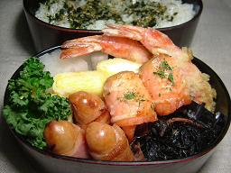 ひじき煮 ウィンナーのベーコン巻き 海老の天ぷら スモークサーモンのマヨ焼き たまご焼き 柚子大根 のりごまご飯