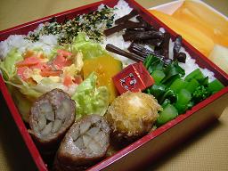ゴボウの照り焼き豚ロール うずらの卵のフライ カボチャの煮物 茹でアスパラ菜 スモークサーモンのスクランブルエッグ チーズトマト味 蕗山椒 のりごまご飯 あたご柿とリンゴ