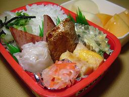 紅白なます たまご焼き 海老しゅうまい ぶりの照り焼き ブロッコリーのグラタン ハム 白菜の塩昆布和え サケと海苔サンドごはん あたご柿とりんご