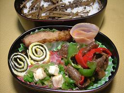 牛肉とピーマンの炒め物 ゴーヤとチーズのサラダ たまごぐるぐる ソースとんかつ ハム そぼろきんぴらごぼうのご飯