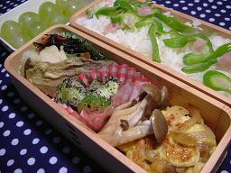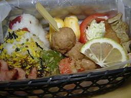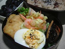 ひじき煮 たまごのサラダ キャベツと芝エビのお焼き ネイゴのフライ 貝割菜のハム巻き 赤飯 ぶどう