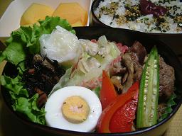 カラーピーマンのマリネ 牛肉と雪茸の甘辛いため キャベツとアサリのスープ煮 ひじき煮 えびシュウマイ ゆで玉子 サラダ菜 海苔ごまごはん あおし柿